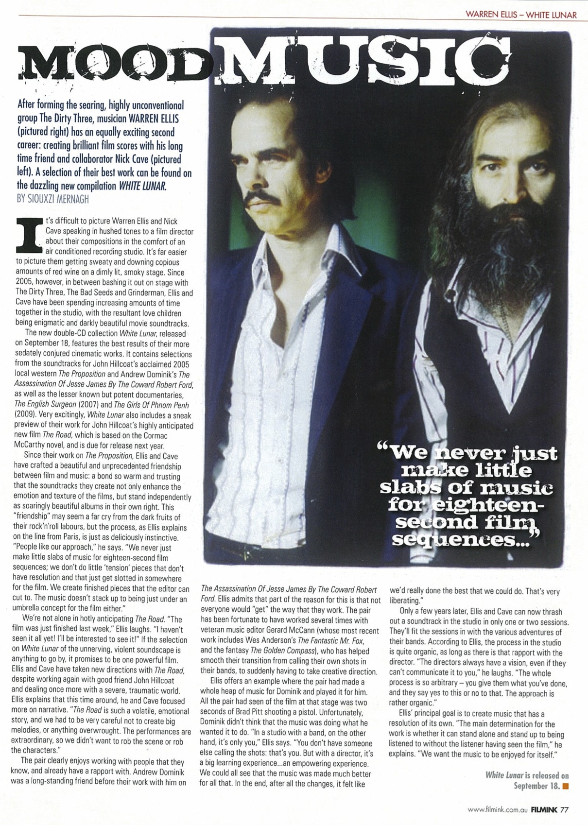 INTERVIEW WITH WARREN ELLIS, THE DIRTY THREE, FOR FILMINK: