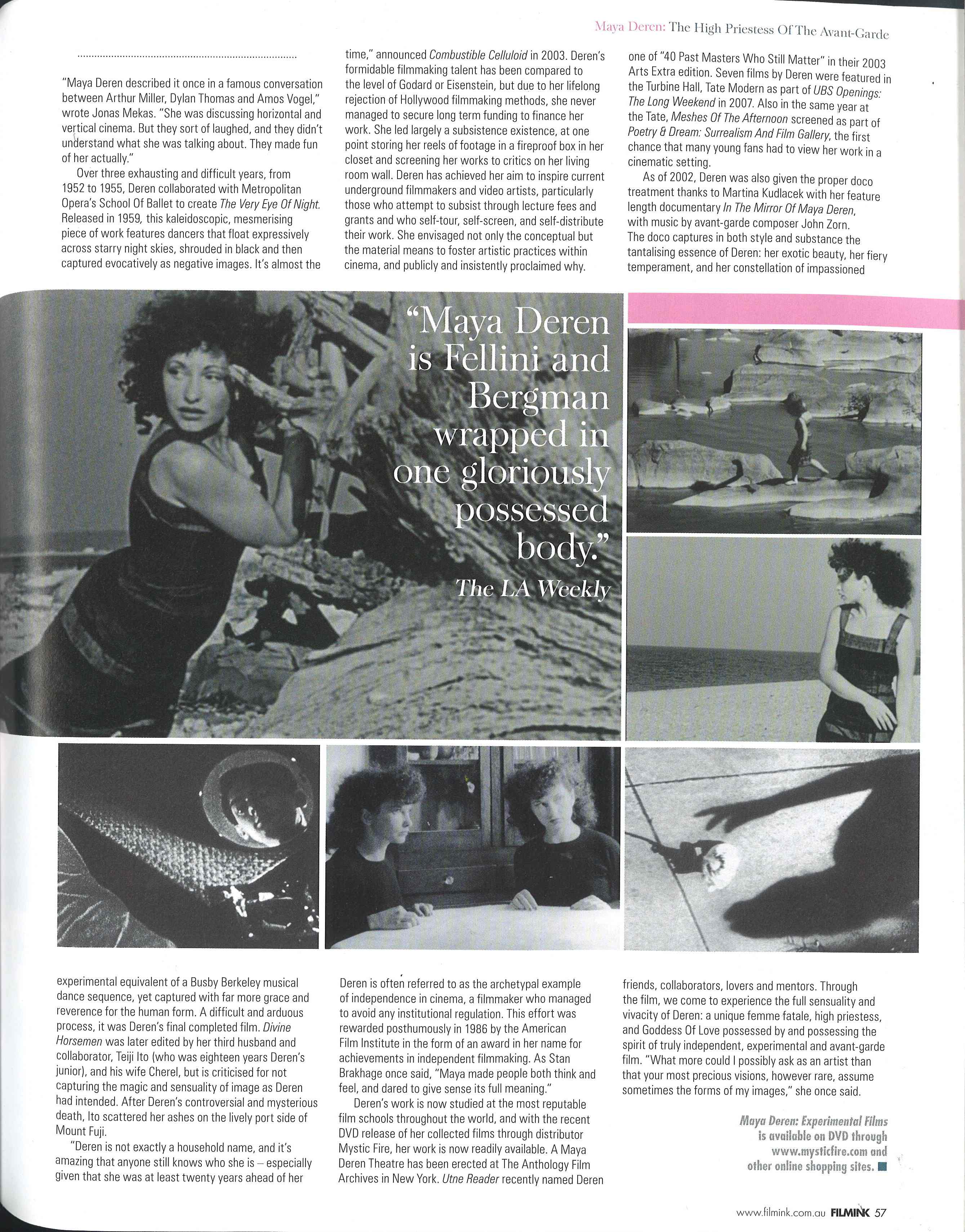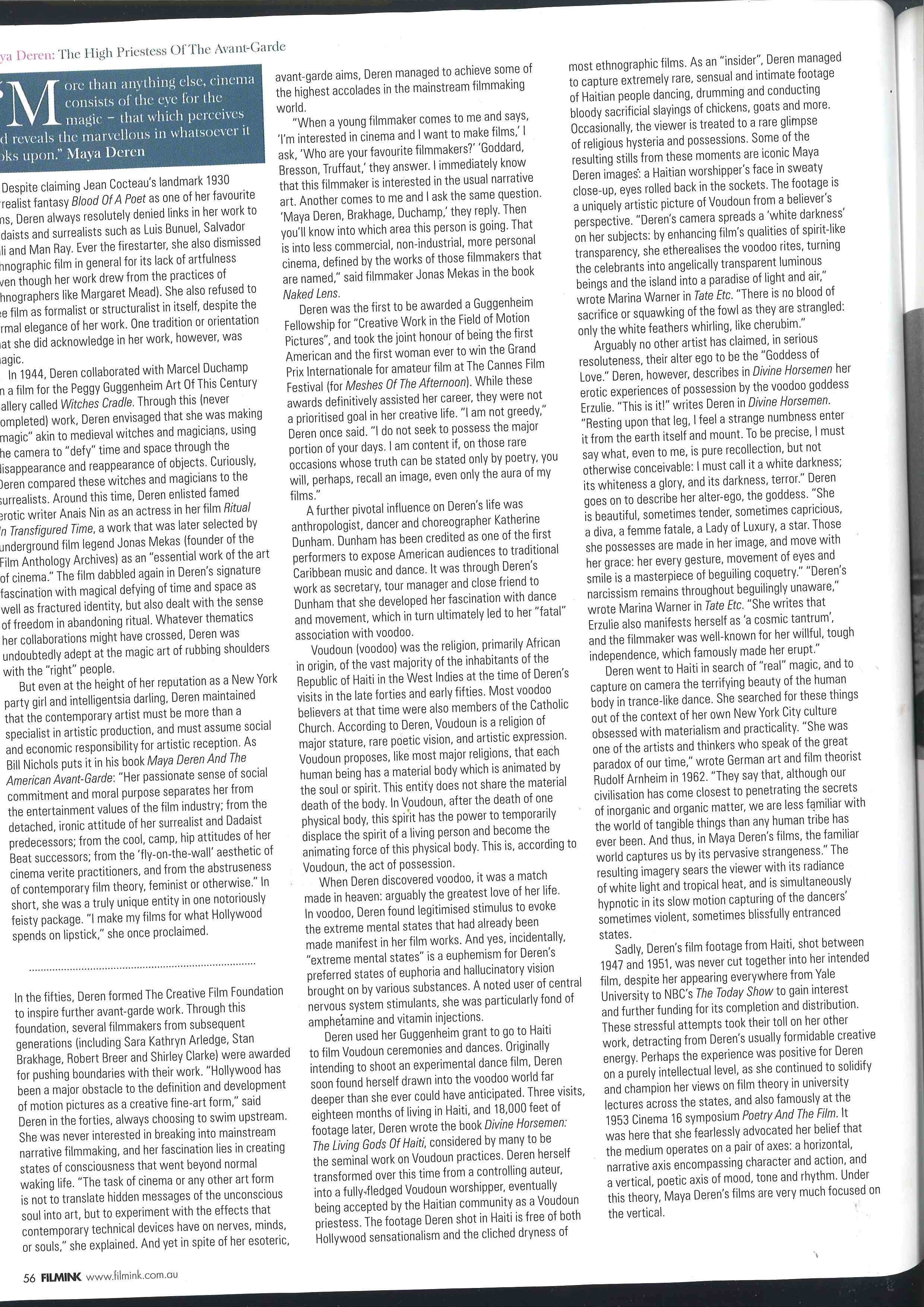 FEATURE ON MAYA DEREN FOR FILMINK: